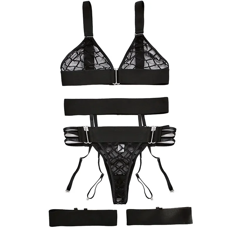 2025 Summer New Ladies Sexy Lingerie Four-Piece Suit Chain Temptation Sexy Bondage Black Hollowing Erotic Women’s Underwear Set