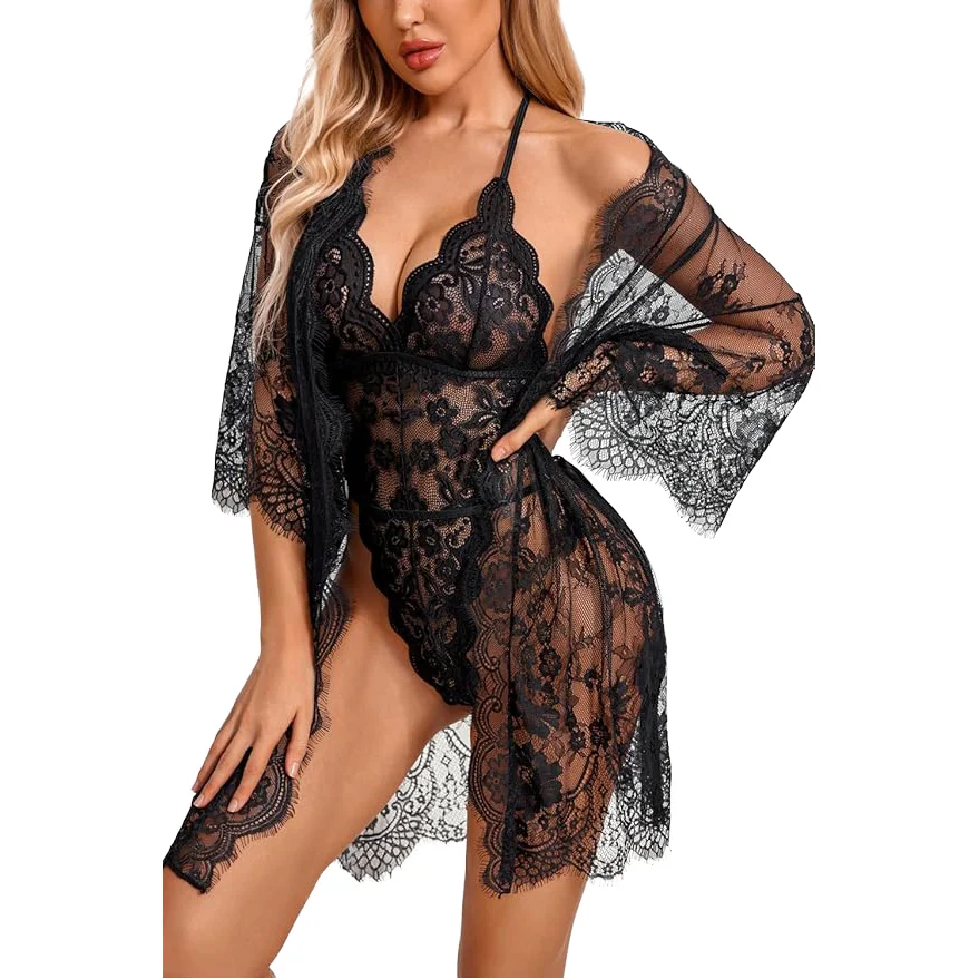 Women’s Comfortable Sexy 2-Piece Lace Lingerie Set Free Size Kimono Robe with Jumpsuit Print Pattern Sleeveless for Night